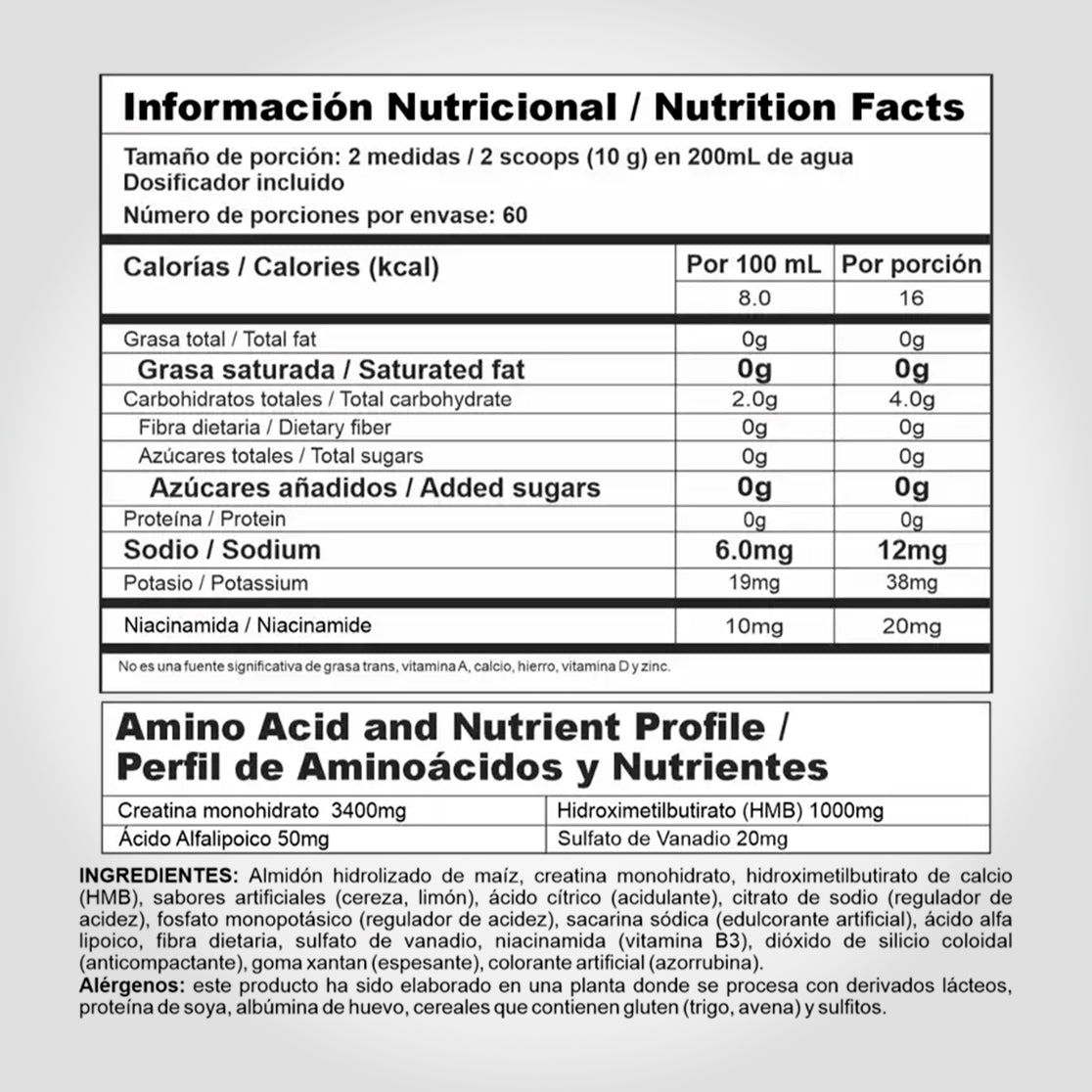 Crea Stack también incluye HMB, ácido alfa lipoico y sulfato de vanadio, cada uno con sus propias propiedades y características positivas en la actividad física.