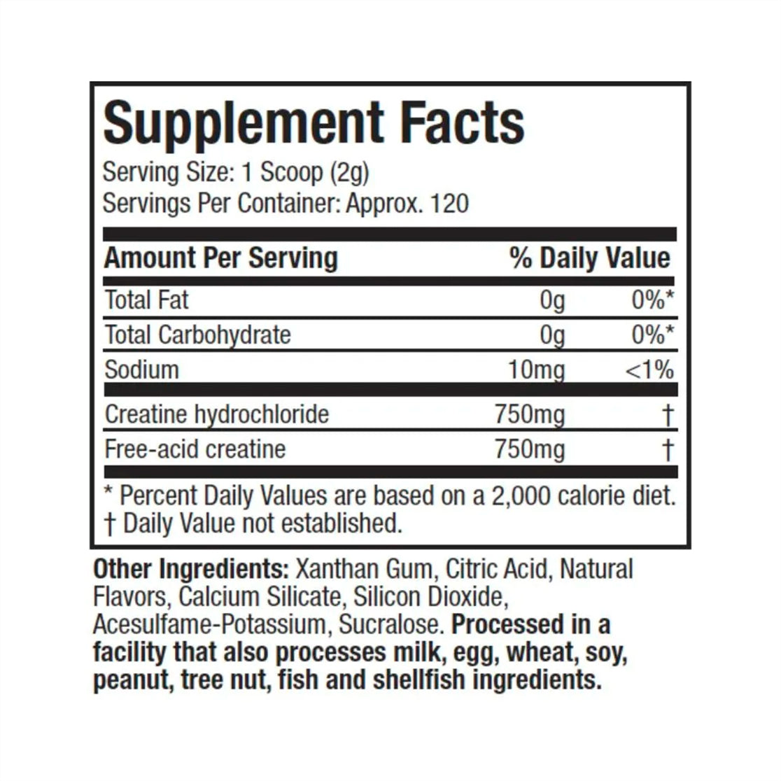 Ingredientes: Creatina HCI, creatina de ácido libre, sabor natural, calcio, silicato.